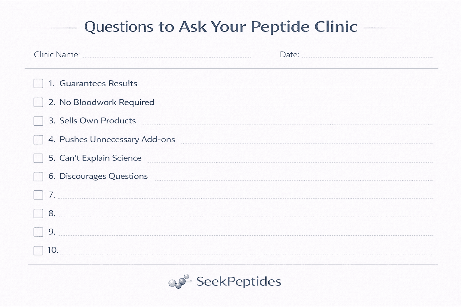 "Where do you source your peptides, and can you provide documentation?" - Legitimate clinics name their compounding pharmacy and can show you licensing information.